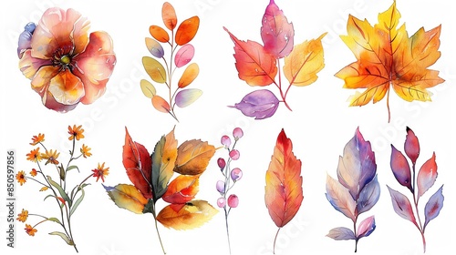 Fototapeta premium Watercolor autumn leaves and flower elements for design.