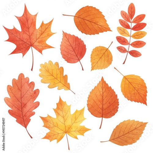 Fototapeta premium Watercolor Autumn Leaves Collection: Orange, Red, Yellow Foliage