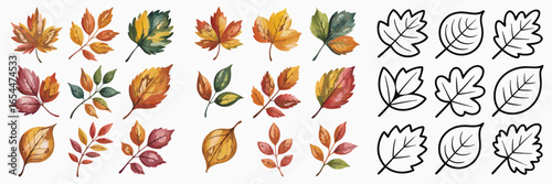 Obraz premium Watercolor Autumn Leaves Collection with Black and White Outlines on a White Background