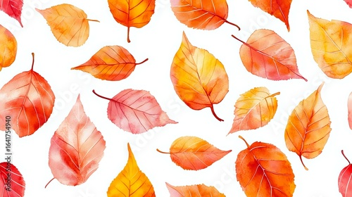 Fototapeta premium Watercolor autumn leaves in orange and red shades scattered on white background, seamless pattern for fabric, wallpaper and seasonal designs.