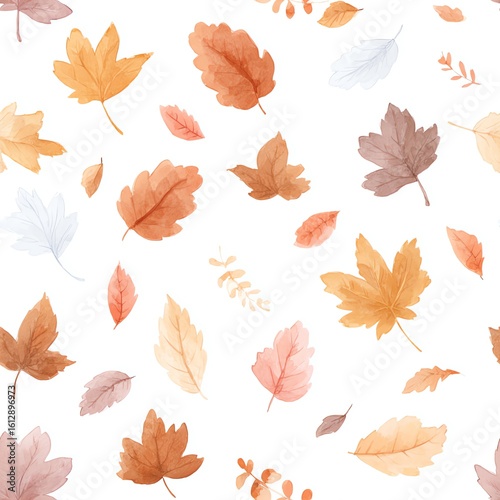 © Priyanut, Obraz premium Watercolor Autumn Leaves Seamless Pattern A Delightful Design Featuring Vibrant Fall Foliage in Warm Hues