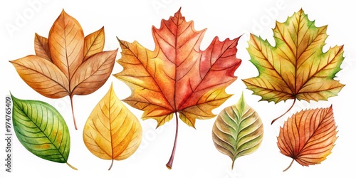 Obraz premium Watercolor Autumn Leaves Set - Detailed Illustration of Colorful Foliage, watercolor, fall, nature, illustration