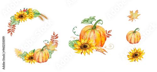 © SvetaArt, Fototapeta premium Watercolor autumn wreath set with pumpkins and fall leaves