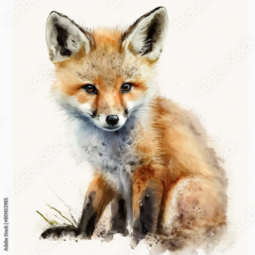 Fototapeta premium Watercolor Baby Fox Whimsical Forest Wildlife, baby cub,Nature,animal,Autumn,Woodland creatures,Gentle,Young,Earthy,portrait,playful,