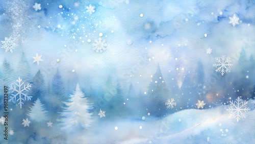 Naklejka premium Watercolor background featuring a serene winter landscape with snowy trees and delicate snowflakes, tranquil and festive