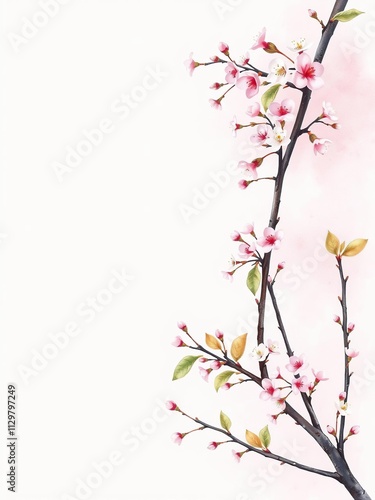 Fototapeta premium Watercolor background featuring delicate cherry blossom branches on a soft...