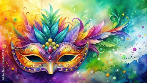Fototapeta premium Watercolor background featuring vibrant Mardi Gras mask , celebration, party, carnival, festive, colorful, masquerade