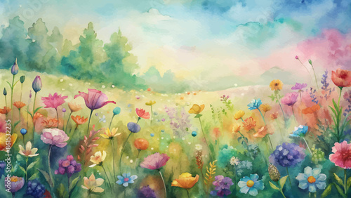 © Fauzi Arts, Fototapeta premium Watercolor background of meadow blooms