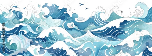 © MEHDI, Obraz premium watercolor background with light blue water waves and traditional Japanese patterns, simple, minimalistic, white background