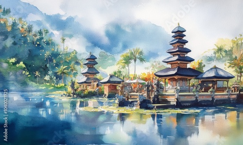 Naklejka premium Watercolor Bali holiday tourism, Ulun Danu Bratan Water Temple Bali, Bali, Indonesia