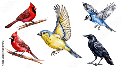 Fototapeta premium Watercolor Bird Collection Cardinals Blue Jay Yellow Finch Crow