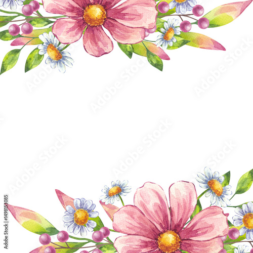 © AnNiStok, Fototapeta premium Watercolor blooming flower horizontal botanical frame. Pink cosmos, white daisy chamomile, berries, green leaves. Hand drawn illustration isolated background. Wedding invitation, save the date.