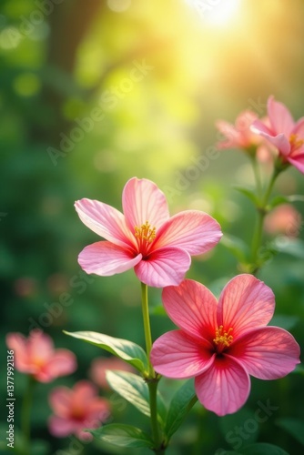 © Panda, Fototapeta premium Watercolor blooms in soft focus, surrounded by lush greenery and warm sunlight, serene, garden