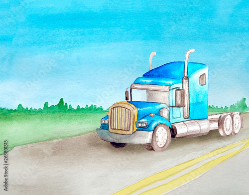 © Анна Лукина, Fototapeta premium Watercolor blue american semi truck tractor without a container rides on an asphalt road against the backdrop of the landscape for logistics or business cards or website design