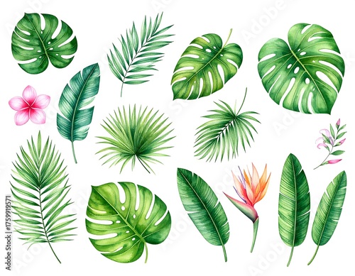 Fototapeta premium Watercolor botanical illustration featuring various tropical leaves and flowers. Lush green foliage depicts popular plants in a vibrant, detailed style