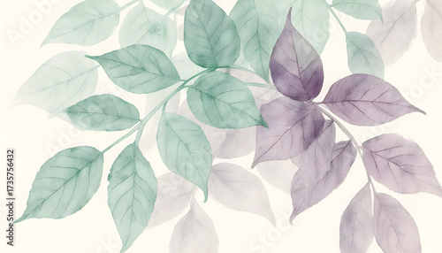 © swdesain, Obraz premium Watercolor Botanical Leaves in Soft Green and Purple Tones on Light Background