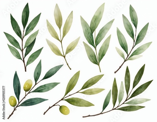 © Vadym, Naklejka premium Watercolor botanical olive branch collection on white backdrop. Natural herbal elements, symbol peace. Hand-drawn fresh green leaves, simple design. Organic vegetarian food, summer garden art
