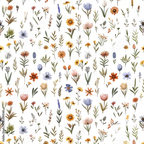 Obraz premium Watercolor botanical pattern of wildflowers and foliage Image