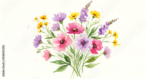 © Fathur, Naklejka premium Watercolor bouquet of wildflowers: A delicate blend of vibrant colors and nature's beauty