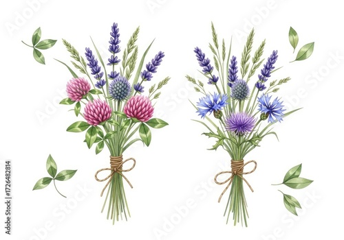 © Shahida, Fototapeta premium Watercolor Bouquet with Lavender, Clover, and Thistle Flowers on White Background