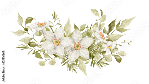 Fototapeta premium Watercolor bouquet with white narcissus flowers, branches and leaves isolated...