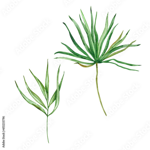 Fototapeta premium Watercolor bright green tropical leaves, for summer designs