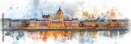 Fototapeta premium Watercolor Budapest Parliament Building and River - Majestic watercolor painting of the Hungarian Parliament Building reflected in the Danube River at dawn. Symbolizing history, architecture, beauty