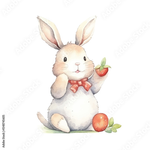 Obraz premium Watercolor Bunny with Red Bowtie Holding Strawberry and Easter Egg
