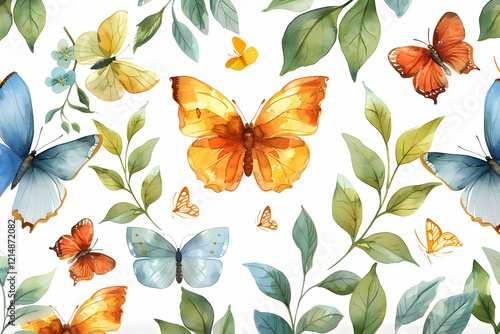 Fototapeta premium Watercolor Butterflies and Leaves Seamless Pattern on White Background.
