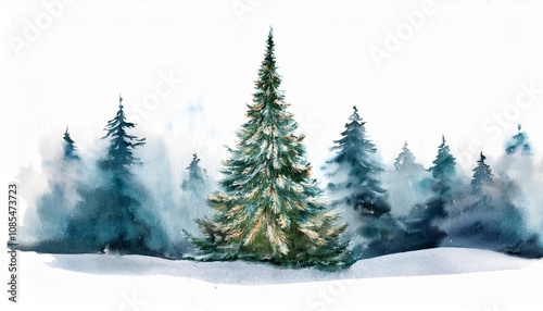 © l1gend, Naklejka premium Watercolor card with Christmas tree and winter forest on a white background. AI generated