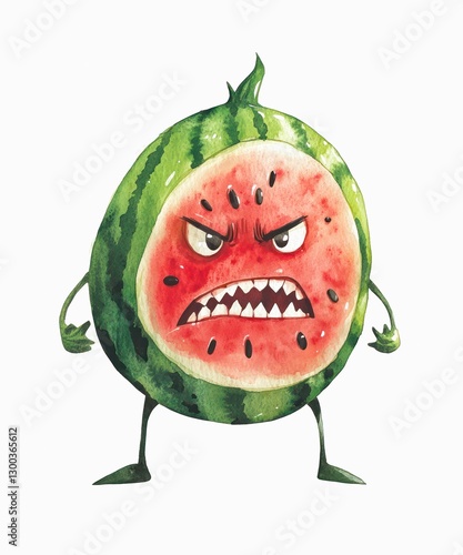 © Hanna, Fototapeta premium Watercolor cartoon illustration of an angry mad watermelon isolated on white background.