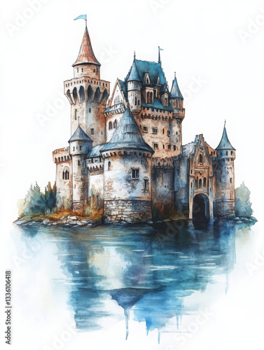 © NanoStudio, Fototapeta premium watercolor castle stands proudly, reflecting beautifully on water