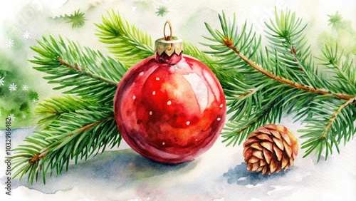 © Caitlin, Naklejka premium Watercolor Christmas Ball with Red Ribbon and Pine Branches on White Background for Holiday Decor, Winter Festivities, and Seasonal Celebrations