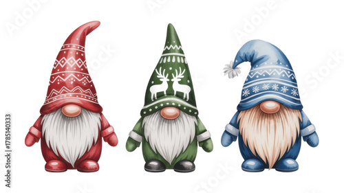 © BOTAHRY DEX, Obraz premium Watercolor christmas gnomes family in hats with scandinavian ornament. Set of nordic magic dwarfs