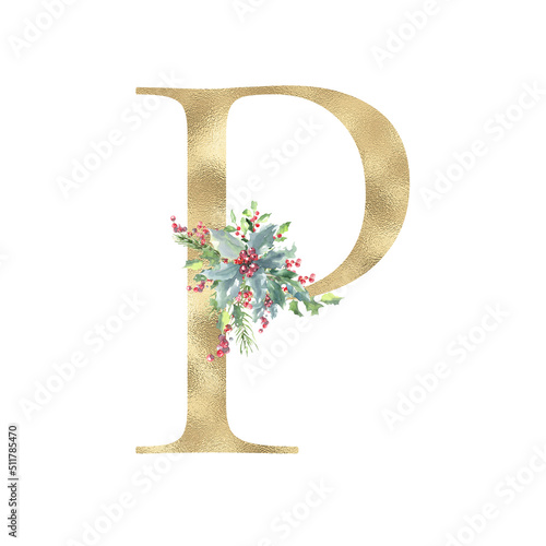 © Catherine, Fototapeta premium Watercolor Christmas Gold Floral Alphabet letter P with floral bouquet, Winter Holiday Animal botanical illustration. Monogram initials for wedding stationery, nursery, greeting card, logo, poster,