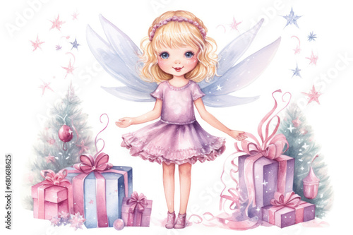 Fototapeta premium Watercolor Christmas Princess. Illustration of magical fairy with wings in pink dress with Christmas trees and gifts. Little angel girl. Ideal for children book, holiday cards, kid decor scrapbooking
