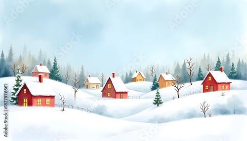 © Stock, Naklejka premium watercolor Christmas village background, hand-painted style, soft snowy textures, pastel houses, gentle blue sky, artistic brush strokes, warm festive feeling, high resolution.