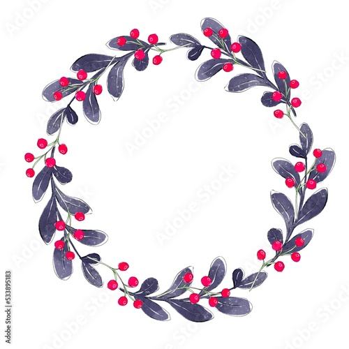 Fototapeta premium Watercolor Christmas wreath. Greenery branches, flowers and red berries. Isolated on white background