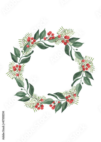 Naklejka premium Watercolor Christmas wreath with greenery and red berries on white background
