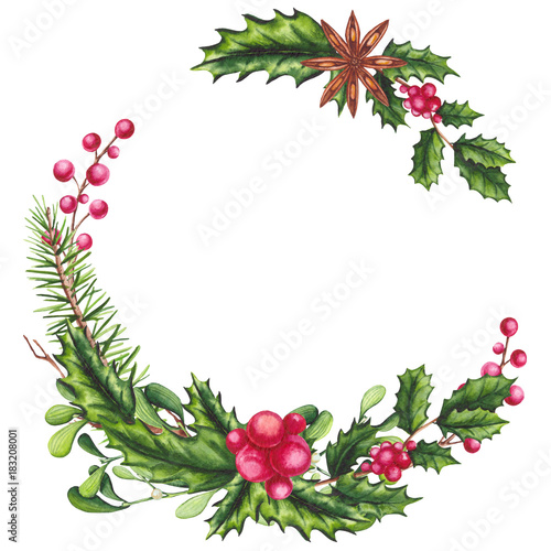 Fototapeta premium Watercolor Christmas Wreath with Holly and Cinnamon