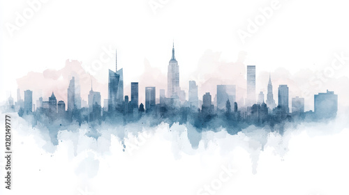 Naklejka premium Watercolor City Skyline with Soft Pastel Colors and Clouds