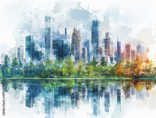 © Yothin, Obraz premium Watercolor Cityscape Reflection Autumn Trees and Modern Buildings