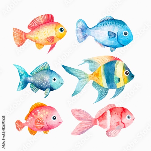 © Hanna, Fototapeta premium Watercolor clip art of colorful fish isolated on white background.
