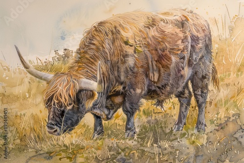 Fototapeta premium Watercolor close up of a grazing highland bull
