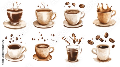 © upnowgraphics, Obraz premium Watercolor Collection of Coffee Cups and Beans