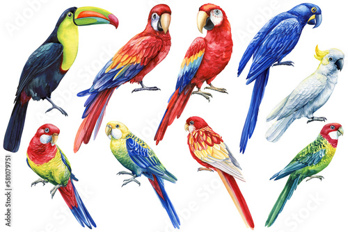 © Hanna, Obraz premium Watercolor colored birds Set. tropical bird, parrot, toucan, rosella and macaw. White isolated background, hand drawing