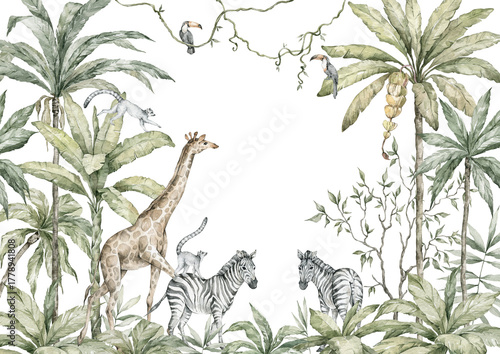 © Kate K., Fototapeta premium Watercolor composition with African animals and nature elements. Giraffe, zebra, lemure, palm trees, greenery. Safari wild creatures. Jungle, tropical illustration for nursery wallpaper