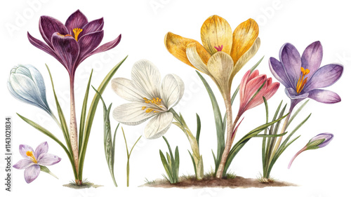 Fototapeta premium Watercolor Crocus Flowers Composition Botanical Illustration, Isolated on White Background, Spring Bloom, Floral Design crocus, watercolor, botanical illustration, spring flowers