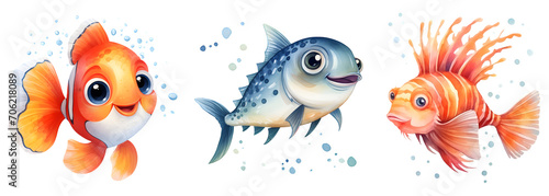 Fototapeta premium Watercolor Cute Aquatic Animals, lionfish, Clownfish, Fish