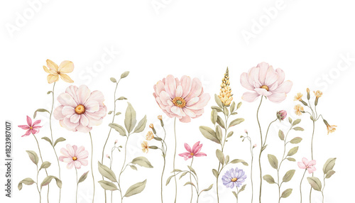 © Nikole, Fototapeta premium Watercolor cute floral border with delicate flowers and green plants. Isolated illustration for cute wallpapers, mural for childish room, invitation or greeting cards. Hand-drawn design elements.
